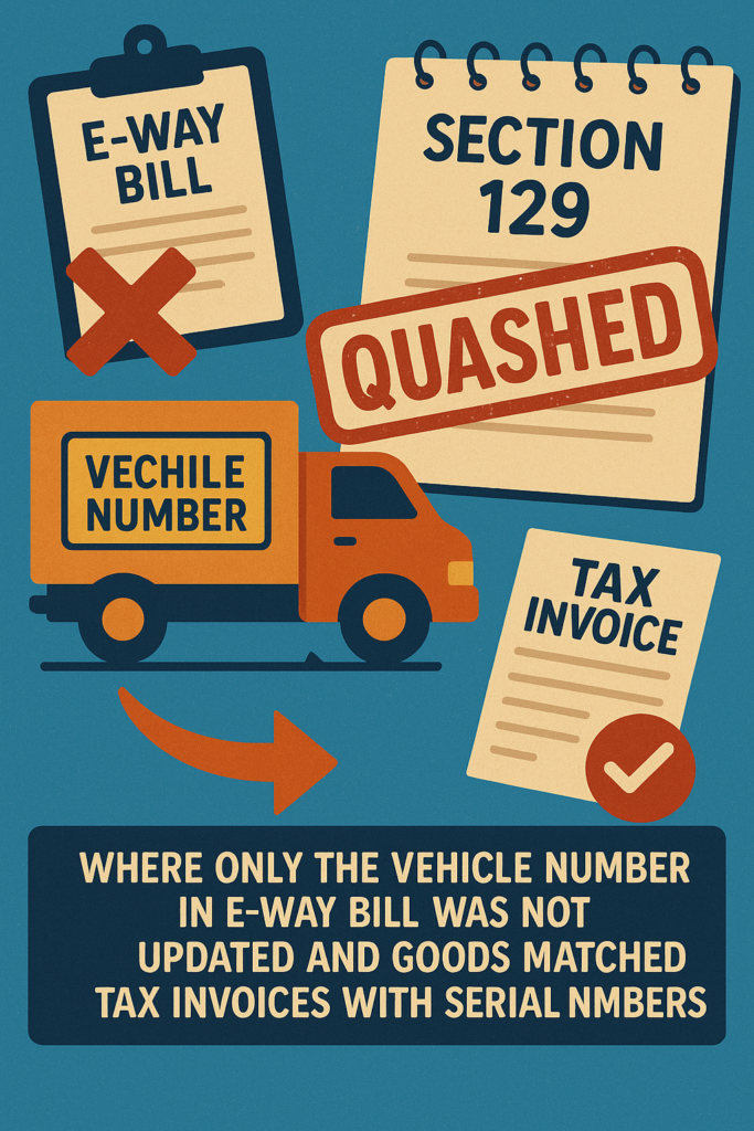 Detention and penalty under Section 129 quashed where only the vehicle number in e-way bill was not updated and goods matched tax invoices with serial numbers.